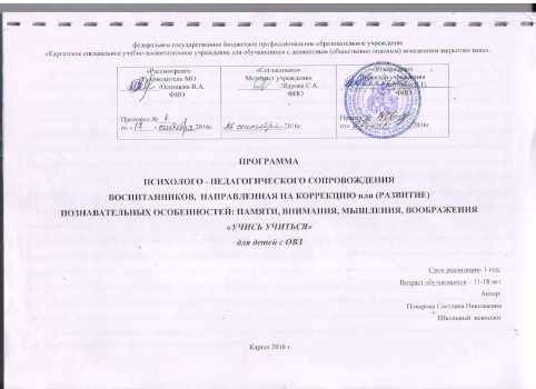 Программа психолого-педагогического сопровождения воспитанников, направленная на коррекцию или развитие познавательных особенностей: памяти, мышления, воображения «Учись учиться» для детей с ОВЗ.