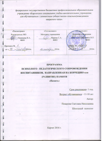 Программа психолого-педагогического сопровождения воспитанников, направленная на коррекцию или развитие памяти «Память»