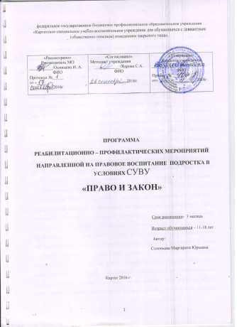Программа реабилитационно-профилактических мероприятий, направленных на правовое воспитание подростка в условиях СУВУ «Право и закон».