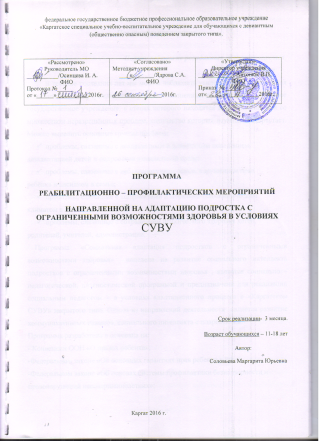 Программа реабилитационно-профилактических мероприятий, направленных на адаптацию подростка с ОВЗ в условиях СУВУ.