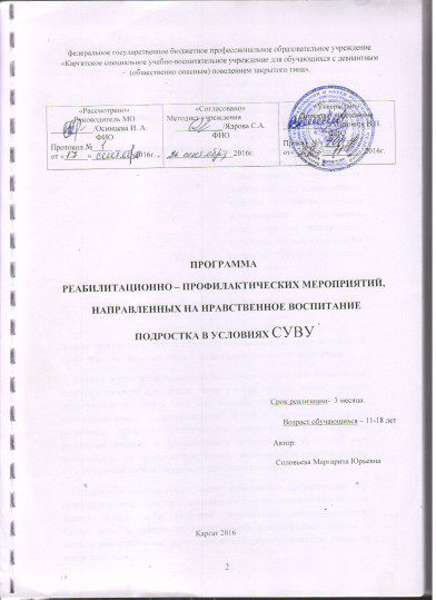Программа реабилитационно-профилактических мероприятий, направленных на нравственное воспитание подростка в условиях СУВУ.