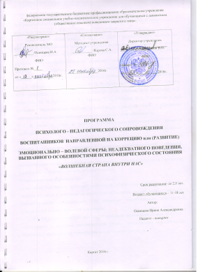 Программа психолого-педагогического сопровождения воспитанников направленной на коррекцию или развитие эмоционально – волевой сферы; неадекватного поведения, вызванного особенностями психофизического состояния «Волшебная страна внутри нас».